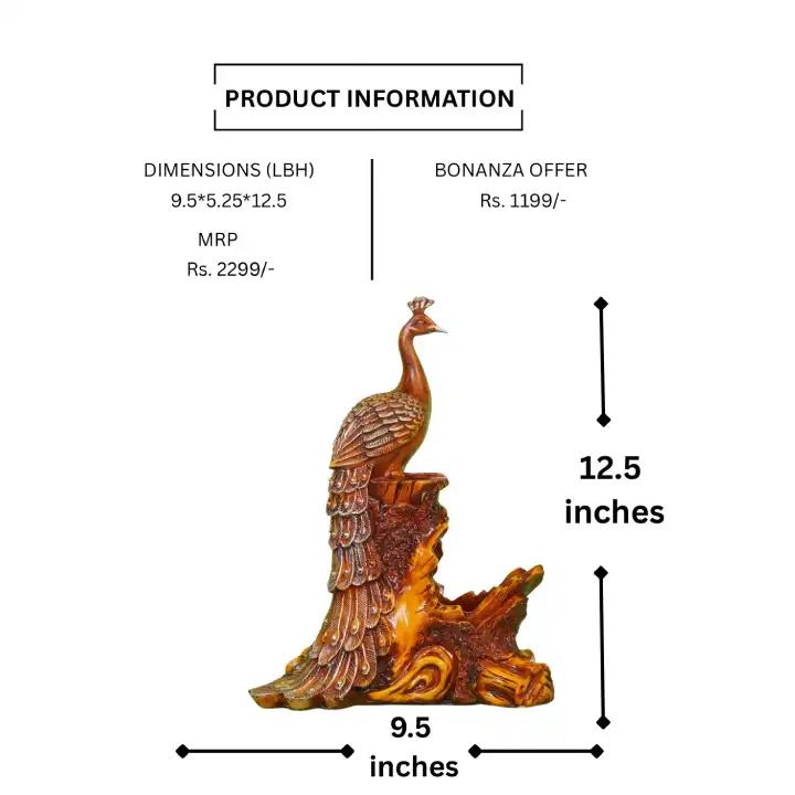- This sculpture features elegant form of peacock with intricate feather and wooden-style detailing in warm-gold and brown tones, blending utility with artistry.